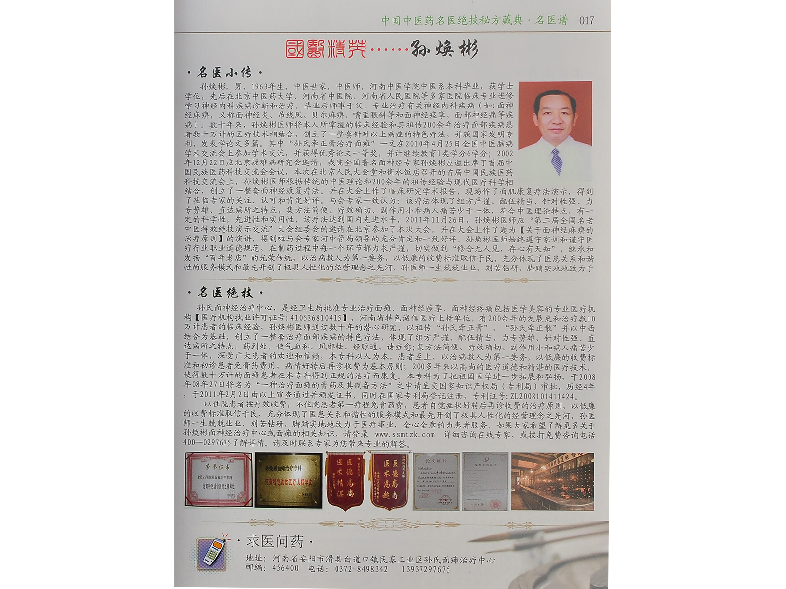 孙焕彬医师:1963年生,中医世家,中医师,孙氏面瘫专科第九代传人,河南中医学院中医系本科毕业,发表论文多篇,获学士学位,先后在北京中医药大学、河南省中医院、河南省人民医院等多家医院临床进修学习神