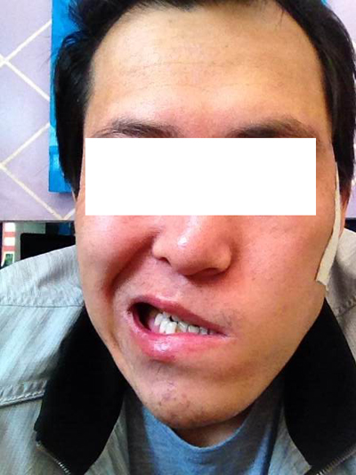 安居文 男 44岁 山东省郓城县双城县双桥乡安庄村 面瘫 患者自述从12年前10月15号突然面瘫,之前曾出汗后用凉毛巾擦脸后一个小时后嘴歪向左侧。当时耳后疼,2天右眼难闭,额纹消失,漏水、饭,塞食。当时在当地贴太阳穴膏药5贴,并服用中药散剂15付(配黄酒),明显好转,后又在当地贴大膏药(贴/日),服B1、甲钴胺片、B12片,效果不明显,11.23号前后在其村输液一周。现说笑时明现嘴歪,右眼流泪,闭不上眼,右嘴角闭不上,不能鼓腮,纳、眠、二便可,既往(-)。